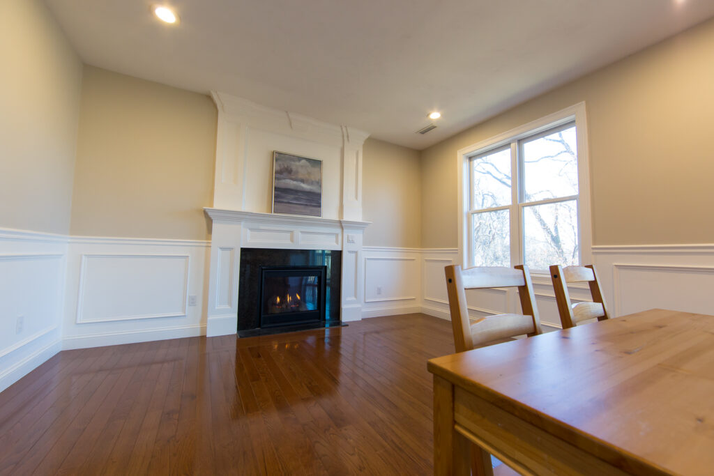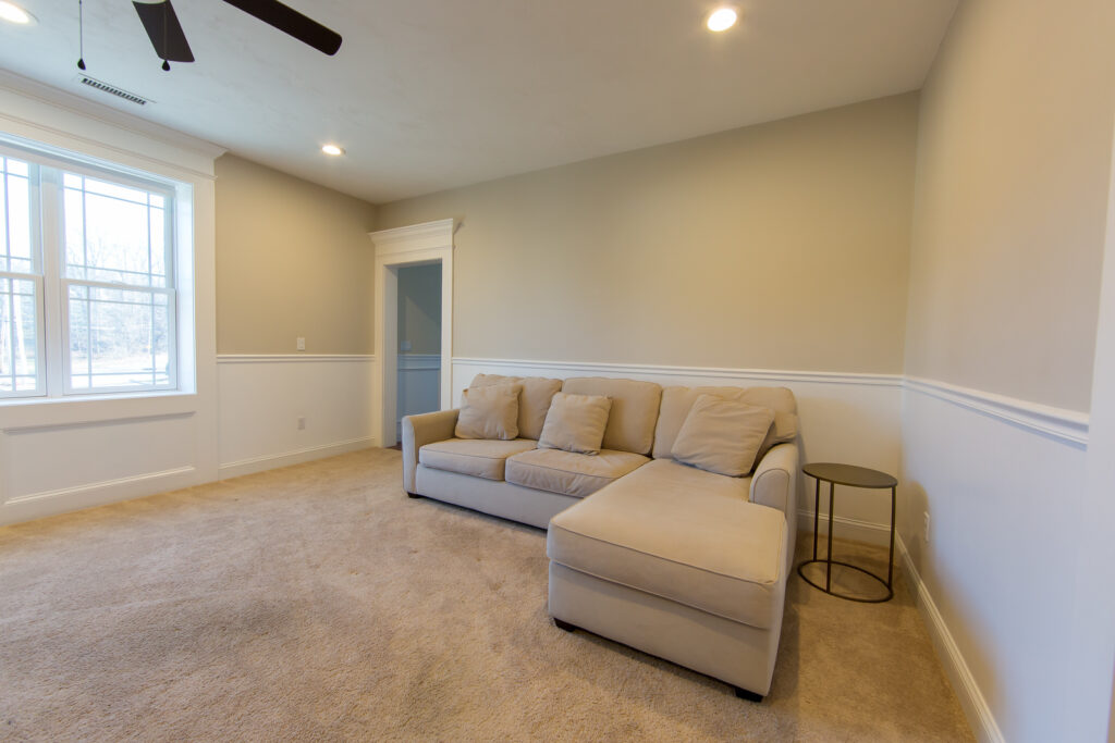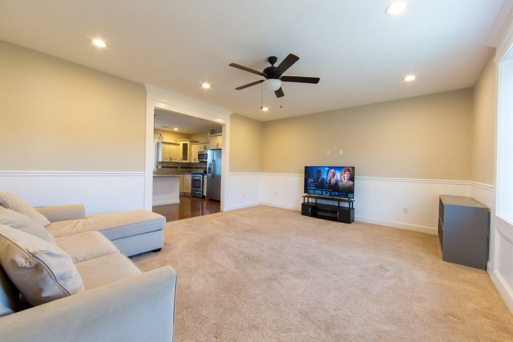 Large family & living room with gas fireplace & a deck plus a full bathroom