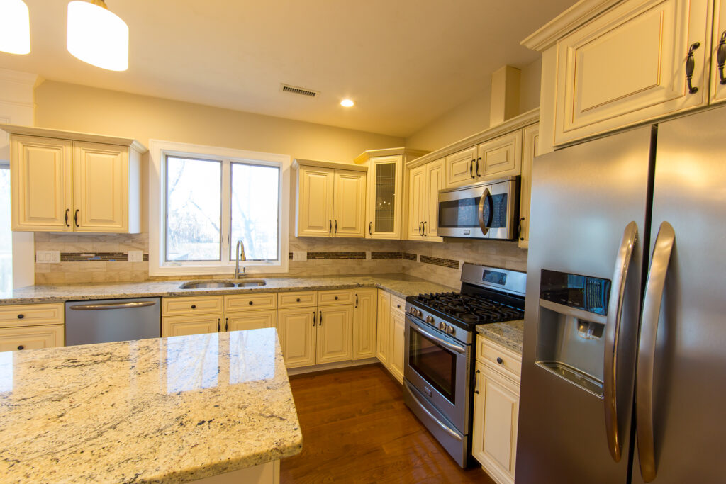 High-end kitchen with stainless steel appliances & granite countertop